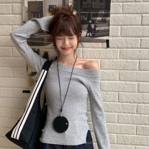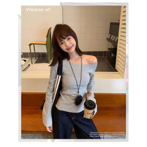 灰色高级感斜肩修身打底衫长袖T恤女秋季2025新款配阔腿裤的上衣