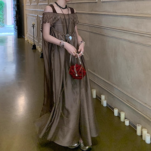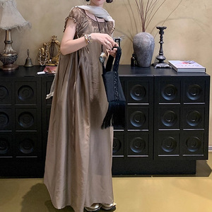 静谧繁复咖棕薄纱抽皱褶绑带背心拼接连衣裙休闲宽松显瘦中长裙