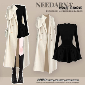 法式米白毛呢外套+黑色蓬蓬裙【套装】
