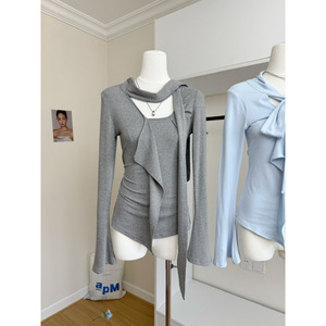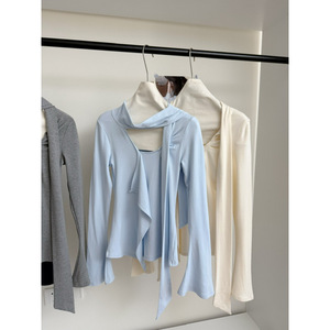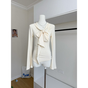 熹凤梨设计感荷叶边飘带长袖藏蓝色上衣百搭打底衫修身内搭T恤女
