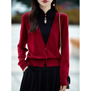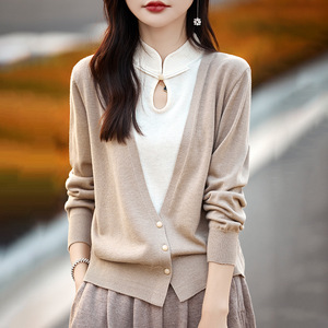 外套女秋国风盘扣立领针织开衫假两件新款非羊毛开衫毛衣打底衫女