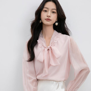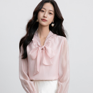 2025秋季V领宽松蝴蝶结雪纺衫长袖女衬衫气质上衣6033