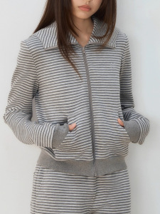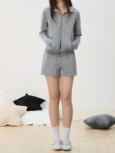 韩系灰色条纹套装随性松弛感懒人穿搭条纹帽衫短裤套装女