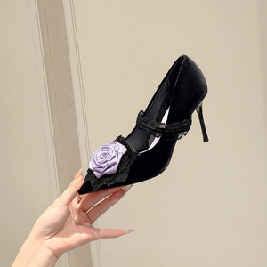 96502 高跟鞋女细跟2025年新款法式拼色尖头浅口绒面气质花朵单鞋