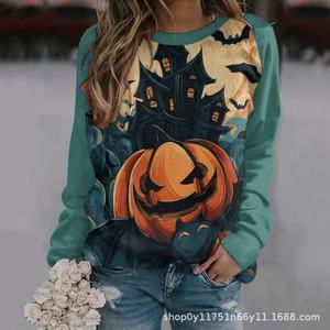 跨境新款万圣节女士卫衣3D数码印花南瓜蝙蝠暗黑图案圆领长袖上衣