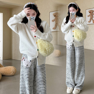 孕妇装秋冬新款韩版时尚慵懒风开衫+条纹阔腿裤居家服可外穿套装