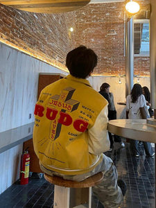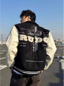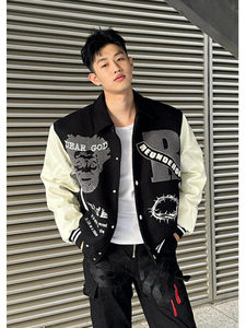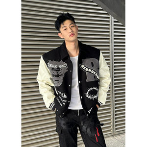 美式拼接撞色植绒刺绣棒球服外套男款春秋欧美hiphop高街痞帅夹克