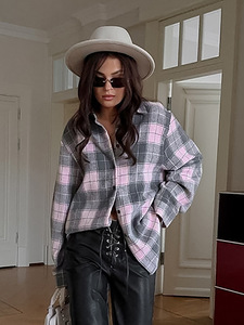 跨境2025欧美新款女装复古格纹翻领女式衬衫宽松时尚休闲衬衣外套