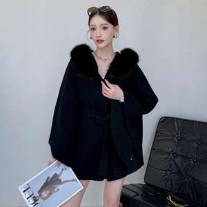 斗篷大衣2025新款仿狐狸毛领连帽针织开衫小个子收腰披肩毛衣外套