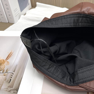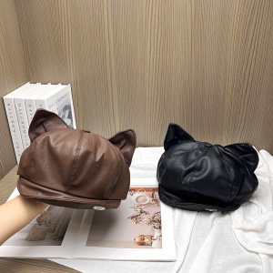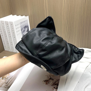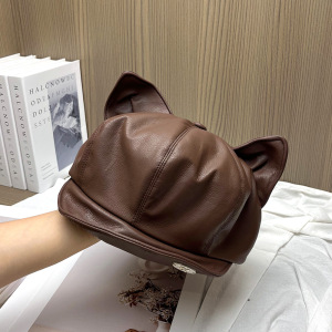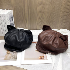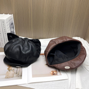 复古pu皮质猫耳朵贝雷帽女秋季甜酷风显脸小蓓蕾帽大头围画家帽子