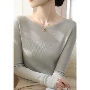 包芯纱新款长袖羊毛上衣女士百搭纯色设计感一字领内搭打底针织衫