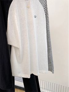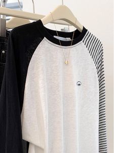 特大码240斤早秋条纹撞色插肩长袖t恤女胖MM宽松雪花棉防晒罩衫
