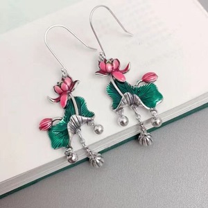 复古珐琅景泰绿荷花耳钩女文艺范民族风气女士长款流苏莲子耳环