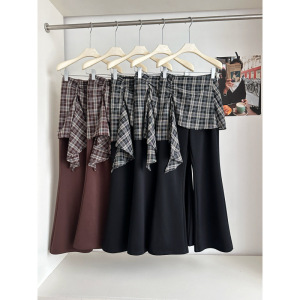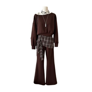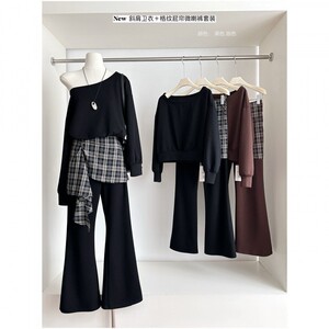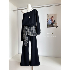 秋上新!韩版穿搭一整套女斜领休闲卫衣+格纹屁帘微喇裤两件套