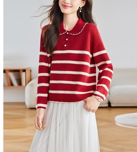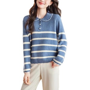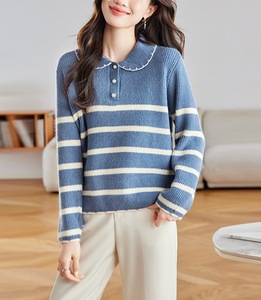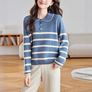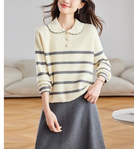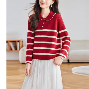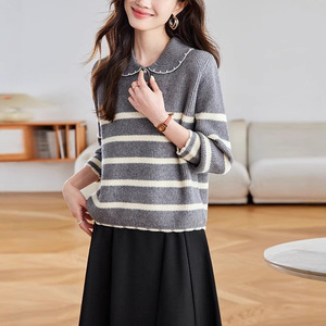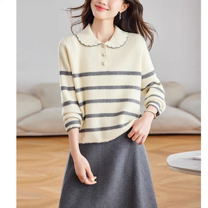 韩系白色条纹娃娃领加厚毛衣女秋冬慵懒高级感针织衫宽松软糯上衣