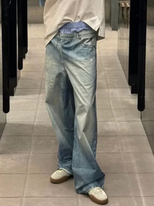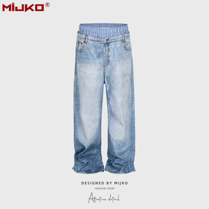 MIJKO男装女3D打印双腰拼接牛仔裤男女同款直筒水洗做旧磨白长裤