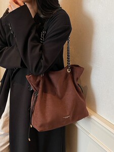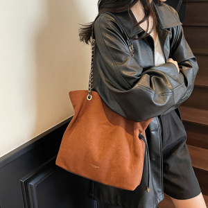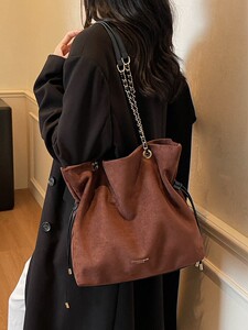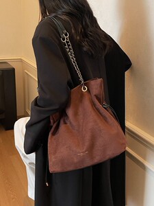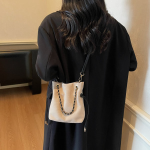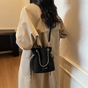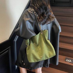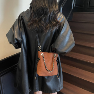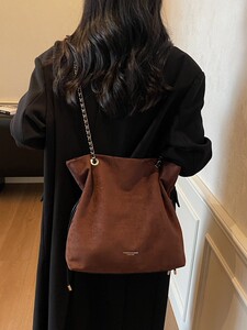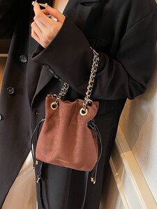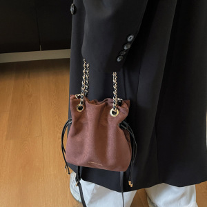包包女复古秋季鹿皮绒链条抽带水桶包2025新款小众设计单肩斜挎包