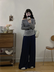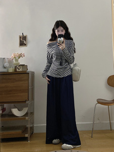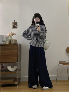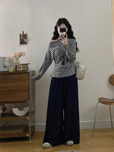 大码女装早秋新款条纹长袖T恤+阔腿裤两件套女