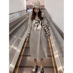 长款过膝卫衣连衣裙女2025早秋冬季韩版新款加绒黑色宽松连帽套头