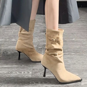 时尚复古美拉德靴子秋季气质显瘦细跟高跟鞋扣带尖头堆堆短靴新款