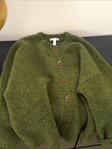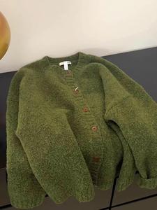 复古绿色针织开衫外套女秋冬加厚慵懒高级软糯毛衣宽松韩系上衣春