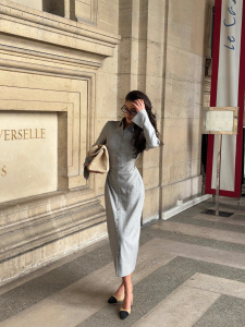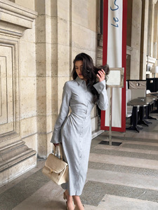 现货欧美风女装气质优雅时尚中性风长袖翻领开衫纯色长款 衬衣连