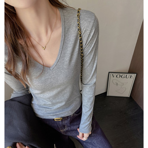 严选早秋纯色V领设计感打底衫女士新款正肩长袖体恤修身内搭上衣