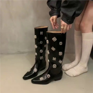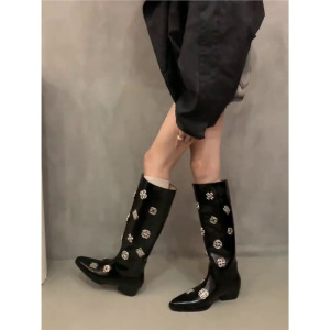 现货羊皮版~气质百搭尖头小众设计金属装饰粗跟遮肉显腿长百搭时