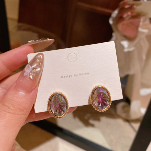 S925银针港风复古百搭气质彩色锆石耳钉小众高级感椭圆形珍珠耳环