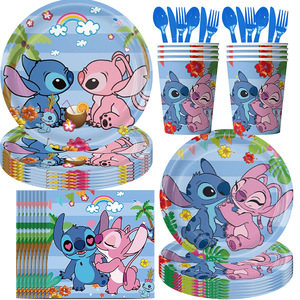 史迪仔生日派对用品一次性餐具拉旗插排刀叉勺桌布纸杯纸巾