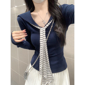 2025秋季新款韩版撞色条纹海军领飘带减龄设计修身长袖T恤上衣女