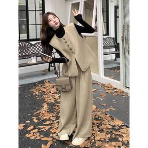 卡其色小香风马甲长裤套装女春季轻奢高级感穿搭休闲阔腿裤两件套