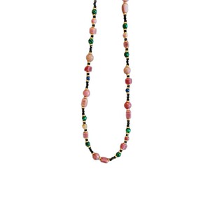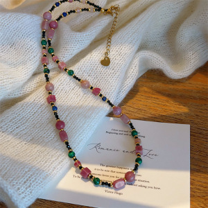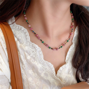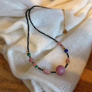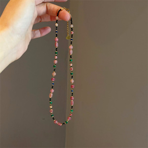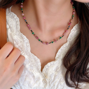 复古原创粉色蔷薇串珠项链女高级感黑色锆石颈链孔雀石头锁骨链