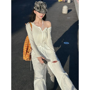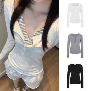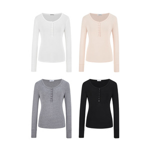 Moses Queen/魔西女王美式半开领纽扣长袖T恤秋季显瘦打底衫上衣