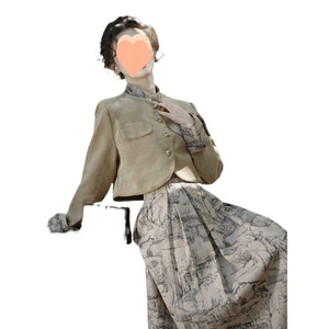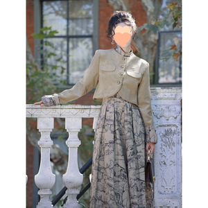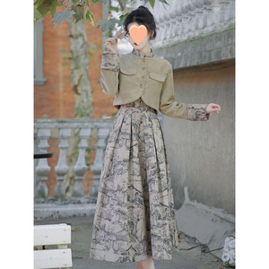 秋冬设计感气质立领灯芯绒外套油画风高腰显瘦半裙小洋装两件套装