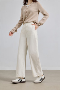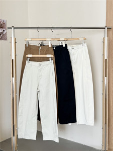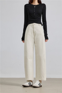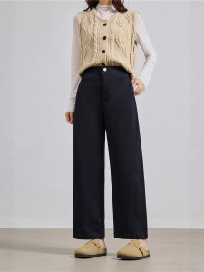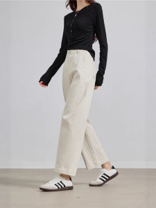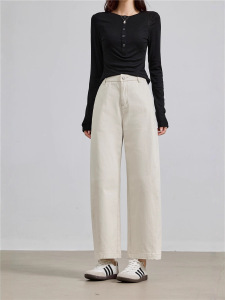 藏青牛仔洗水全棉 遮肉不显胯杏色牛仔裤女小众显瘦阔腿裤子