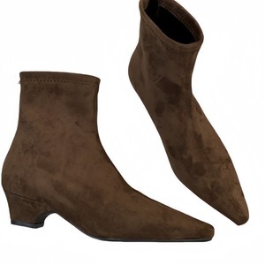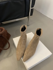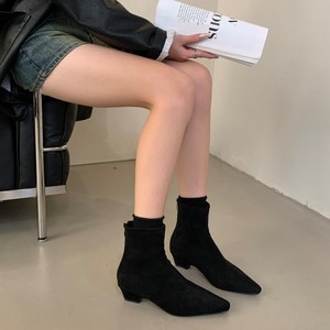 百搭小短靴女2025新款春秋冬季法式中跟粗跟尖头弹力绒面瘦瘦靴子