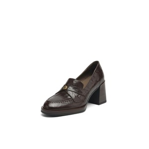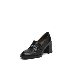 秋季新款牛皮版~山茶花乐福鞋复古高跟单鞋女粗跟懒人鞋小皮鞋女