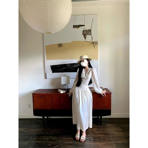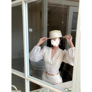 法式气质感白色蕾丝拼接V领长袖镂空衬衫女新款高腰半身长裙套装