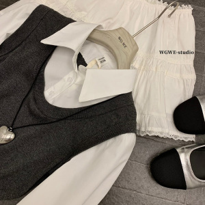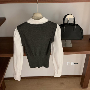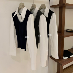 WGWE6951韩版设计感拼接针织背心衬衫小众假两件套学院风上衣