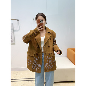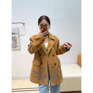 25秋装新品女三色真皮皮衣刺绣双排扣复古风百搭时尚修身高级感潮