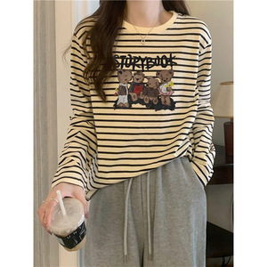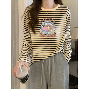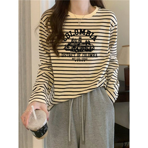 大码胖mm撞色条纹长袖t恤女早秋2025新款设计感宽松纯棉打底上衣