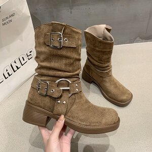 大码女鞋41到43复古厚底西部骑士靴女秋冬皮带扣时尚机车马丁靴