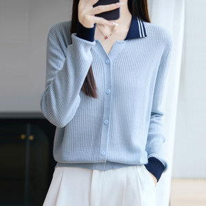 【厂家直供】早秋新款拼色翻领长袖开衫上衣女宽松减龄外搭针织衫