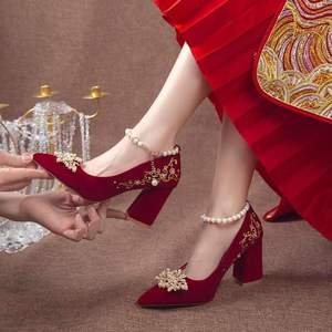 婚鞋女2025年春秋新款粗跟不累脚高跟鞋结婚孕妇红色新娘鞋秀禾鞋