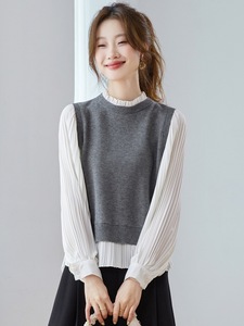 2025早秋新款女装时尚韩版拼色拼接木耳边领针织衫套头气质上衣