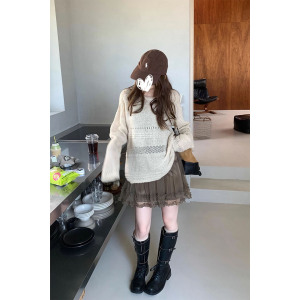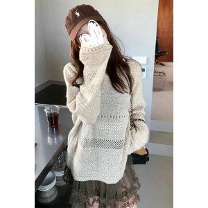 2025新款时尚感穿搭薄款燕麦色镂空长袖针织衫女宽松休闲松弛上衣
