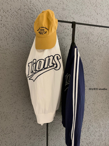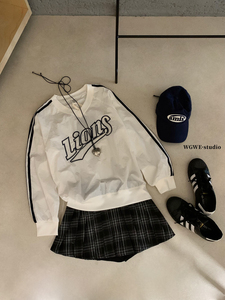 WGWE秋季女美式复古慵懒风字母印花潮牌百搭条纹V领长袖T恤W6852
