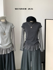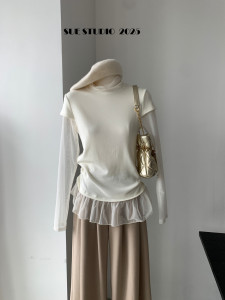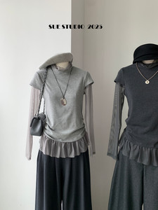 SUE十三行韩系百搭氛围感网纱拼接堆堆领打底衫秋季新款上衣97020