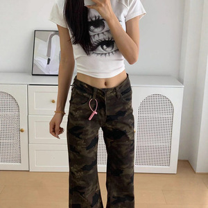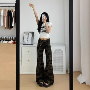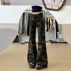 美式复古迷彩工装微喇牛仔裤女秋季低腰不贴腿马蹄喇叭裤拖地裤子